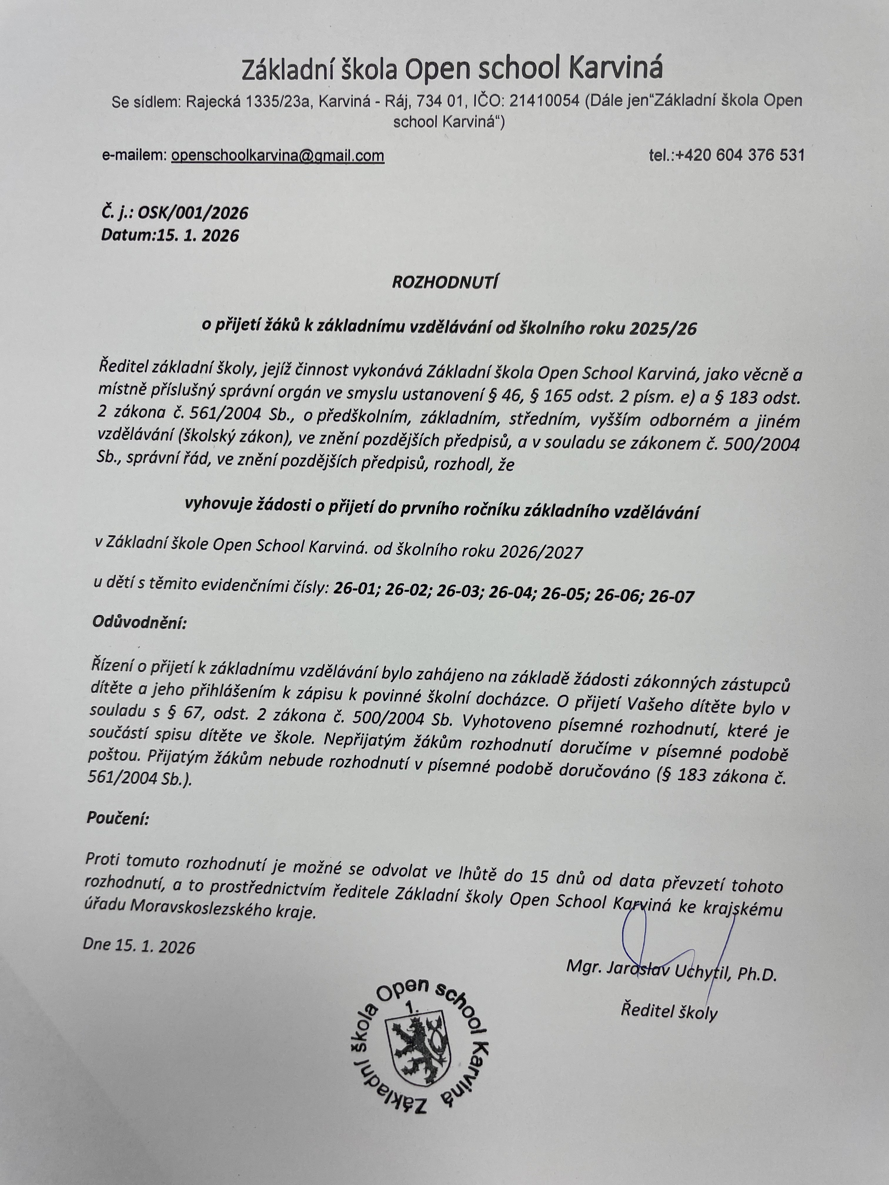 Podmínky pro přijetí k základnímu vzdělávání: